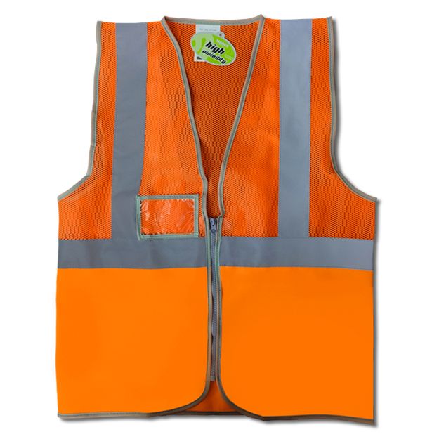 Chaleco alta visibilidad con cierre frontal de cremallera vertical, visible, de poliéster de dientes de 6mm, desde bajo prenda con tope a medio pecho y porta etiquetas transparente con mismo ribete que la prenda.