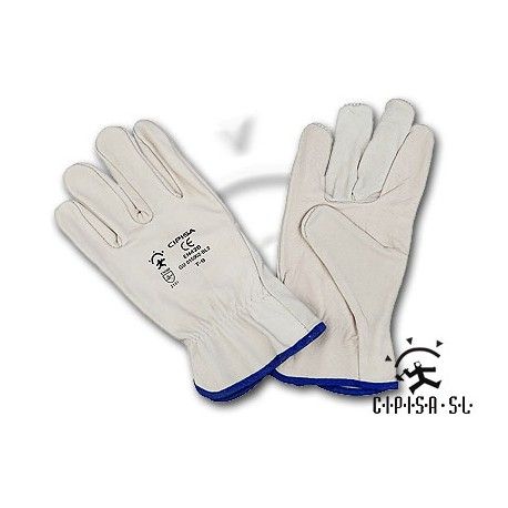 Guante tipo conductor flor vacuno color natural con ribete. Aplicaciones: Manipulación General. Riesgos Mecánicos. Actividades de manipulación con riesgos mecánicos en medio seco donde se necesite una mayor comodidad y tacto, tales como trabajos de conducción (camiones, operadores de grúa), carga y descarga, tareas de logística, automoción, obra pública, fabricantes de equipos, construcción.